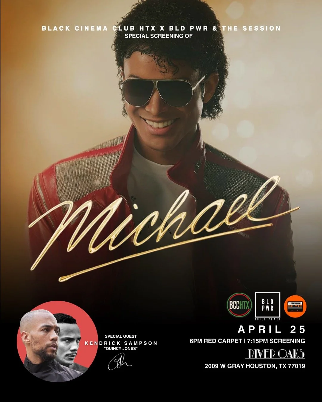 HOUSTON, TX — April 21, 2026 — BLD PWR, Black Cinema Club HTX, and The Sessions are proud to announce a special screening of MICHAEL, the highly anticipated biographical film directed by Antoine Fuqua, on Saturday, April 25, 2026 at River Oaks Theatre in Houston, Texas. The screening features Houston’s own, actor and activist Kendrick Sampson as a special guest. Sampson, who portrays legendary music producer Quincy Jones in the film, will be in attendance for the red carpet, a special introduction before the film, and a post-screening conversation.