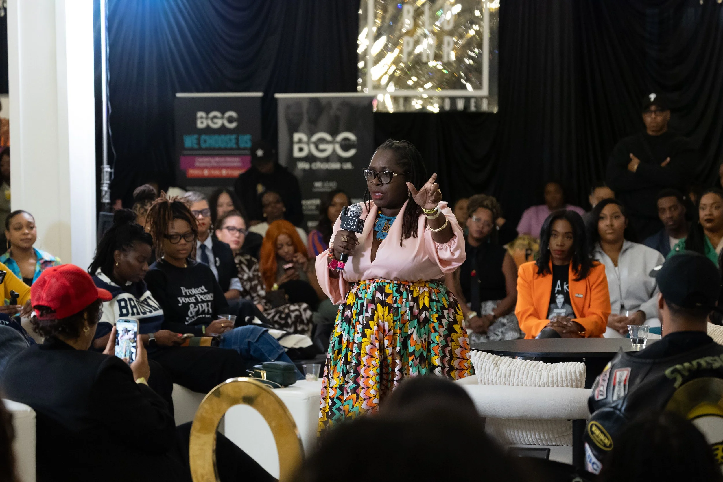 The event’s format was intentionally intimate and radically inclusive: couches arranged in circles, not rows. Conversations flowed like family reunions, with DJ Bola Maintain’s soundtrack weaving between segments, and a Confessional Booth inviting guests to define what “Blackness” and “building power” means to them on camera.